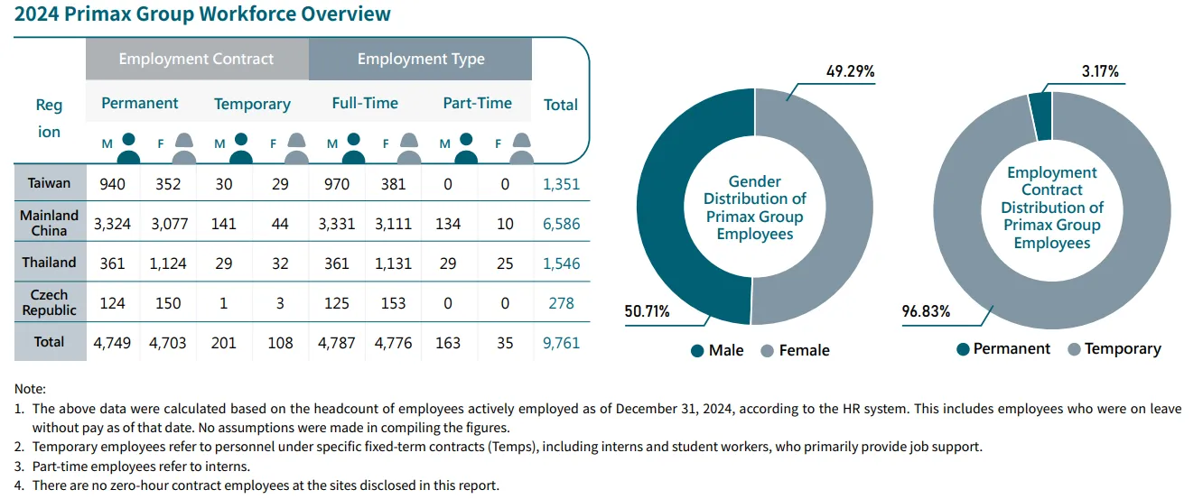 In 2024, Primax Group employed a total of 9,761 people, of whom 96.83% were permanent employees and 3.17% were temporary employees. The workforce comprised 50.71% male and 49.29% female employees. Among them, Primax employed 6,464 people, with 96.13% in permanent positions and 3.87% in temporary roles. The gender distribution was 50.68% male and 49.32% female. Tymphany employed 3,297 people, with 98.21% permanent employees and 1.79% temporary employees. The workforce was composed of 50.77% male and 49.23% female employees.