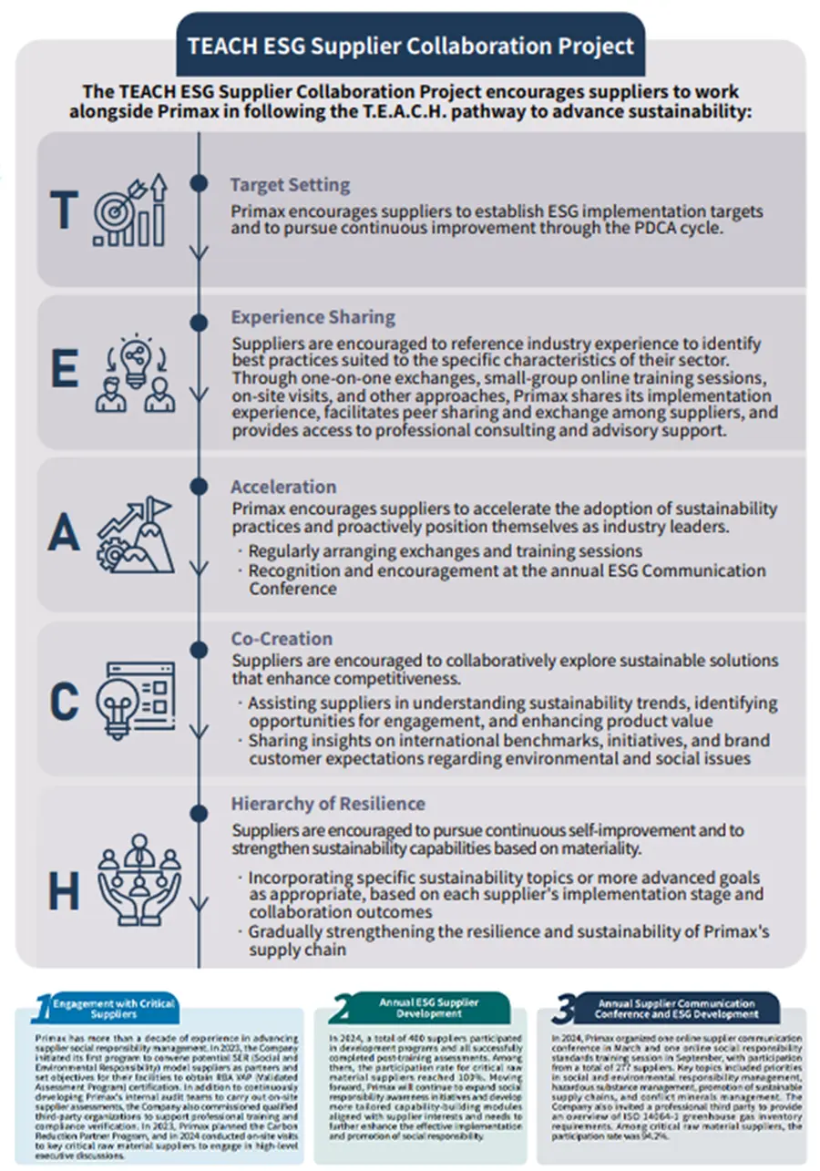 In the context of rapidly expanding and deepening sustainability issues, Primax has remained consistently engaged and proactive. Grounded in meeting the expectations of customers and investors, and dedicated to identifying shared sustainable solutions, the Company aims to maximize industry resources and benefits through alliances with industry partners, while supporting the United Nations SDG 17, Partnerships for the Goals. Primax's goal is to work hand in hand with supplier partners through the "TEACH ESG Supplier Collaboration Project." By convening suppliers around specific sustainability topics, the Company strives to create more opportunities and resources for learning, capability building, and advancement, fostering continuous progress together.