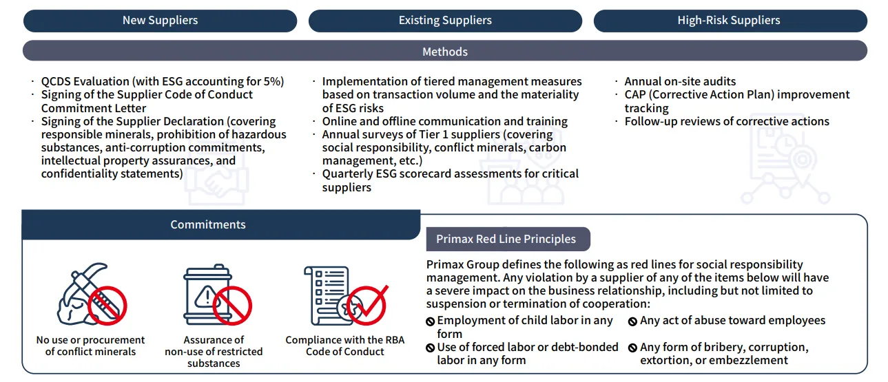 Primax Group practices responsible procurement management and requires suppliers to commit to compliance with applicable local laws and industry codes of conduct to protect the legitimate rights and interests of employees. To further standardize responsible sourcing practices, Primax Group has established the Supplier Code of Conduct. This Code is formulated based on conventions of the International Labour Organization (ILO), the Responsible Business Alliance (RBA), other international labor and human rights conventions, recognized social responsibility management systems (such as ISO 45001 and ISO 14001), and customer requirements regarding labor rights, environmental protection and occupational health and safety, conflict minerals management, and business ethics. It applies to all suppliers of Primax Group and its subsidiaries.