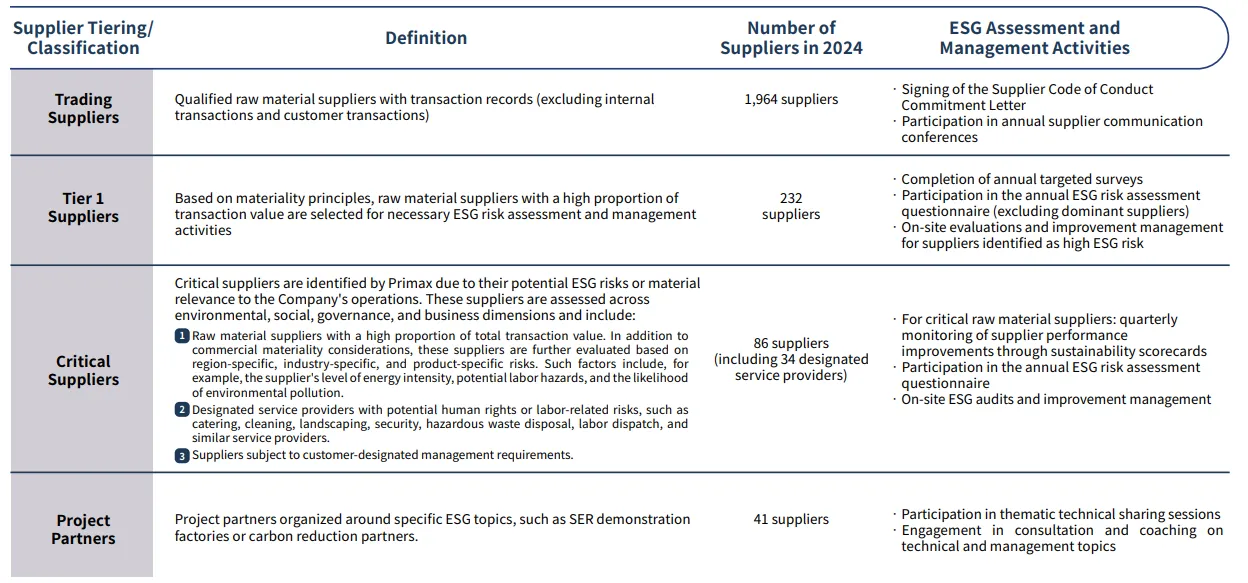 Primax has more than a decade of experience in advancing supplier social responsibility management. In 2023, the Company initiated its first program to convene potential SER (Social and Environmental Responsibility) model suppliers as partners and set objectives for their facilities to obtain RBA VAP (Validated Assessment Program) certification. In addition to continuously developing Primax's internal audit teams to carry out on-site supplier assessments, the Company also commissioned qualified third-party organizations to support professional training and compliance verification. In 2023, Primax planned the Carbon Reduction Partner Program, and in 2024 conducted on-site visits to key critical raw material suppliers to engage in high-level executive discussions.