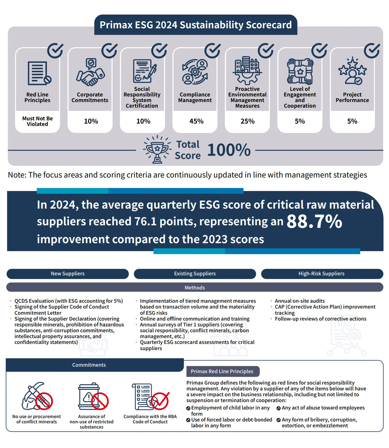 Primax evaluates the ESG performance of critical raw material suppliers each quarter using a sustainability scorecard. Based on the suppliers' ESG score ranges, their quarterly QCDS overall scores may be positively or negatively adjusted by up to 10% weighting. If a critical supplier's final comprehensive performance rating remains at Grade C (below 60 points) for two consecutive quarters, the Company will initiate a process to suspend new project applications with that supplier. Through this robust and iterative mechanism, Primax aims to raise the overall level of sustainable development across the supply chain. Suppliers demonstrating strong performance or exemplary practices will be publicly recognized and invited to share their implementation experiences at the annual supplier communication conference. In addition, Primax promotes greater transparency by disclosing supplier scoring results and rankings to encourage broader sharing of best practices within the industry. The focus areas and weighting of the sustainability scorecard are as follows: