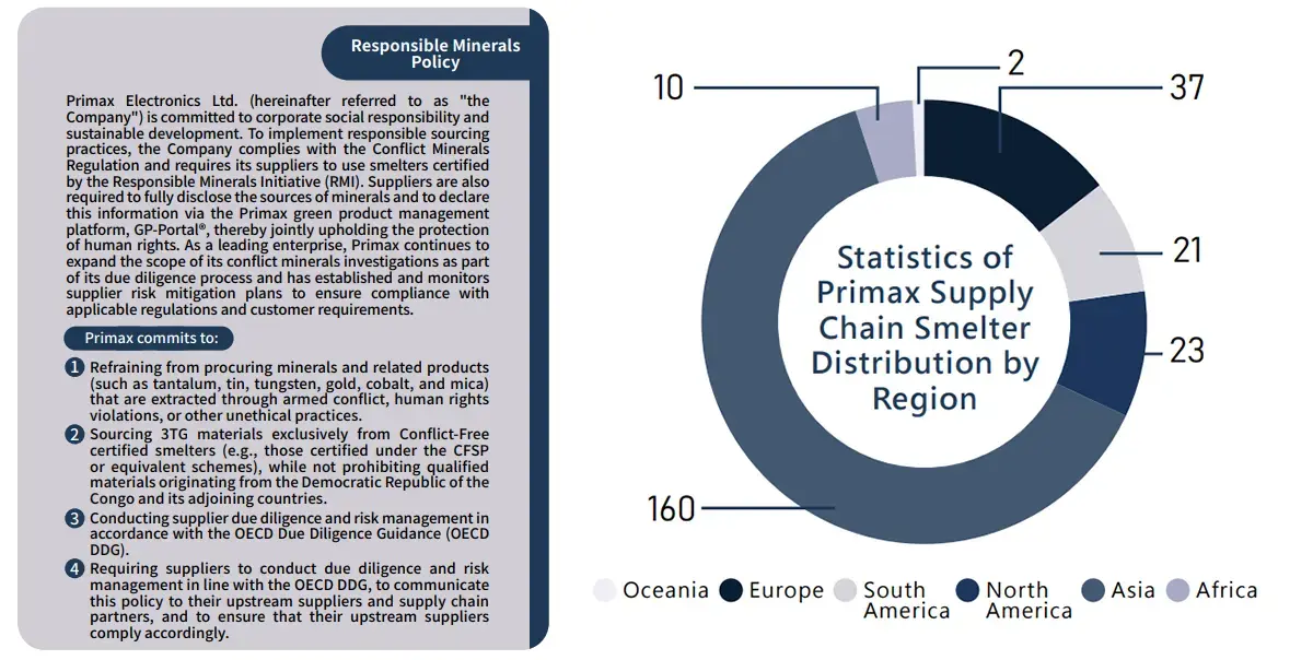 Since 2012, Primax has explicitly complied with the Conflict Minerals Regulation, prohibiting the use and procurement of conflict metals (such as tantalum, tin, gold, and tungsten) sourced from conflict-affected regions of the Democratic Republic of the Congo. The Company requires all suppliers to commit to responsible sourcing of minerals and strives to ensure that minerals used in its products (including tantalum, tin, gold, and tungsten) do not contribute to funding armed conflict. This policy has been incorporated as a mandatory requirement in supplier procurement management and product design. Suppliers utilizing conflict metals are required to disclose smelter information and declare it through the Primax green product management platform, GP-Portal®.【For more detailed information, please refer to "2024 Primax Conflict Minerals Report"】
