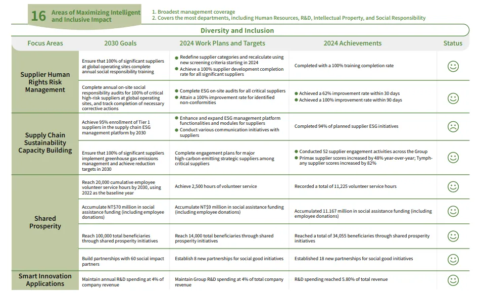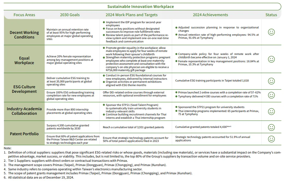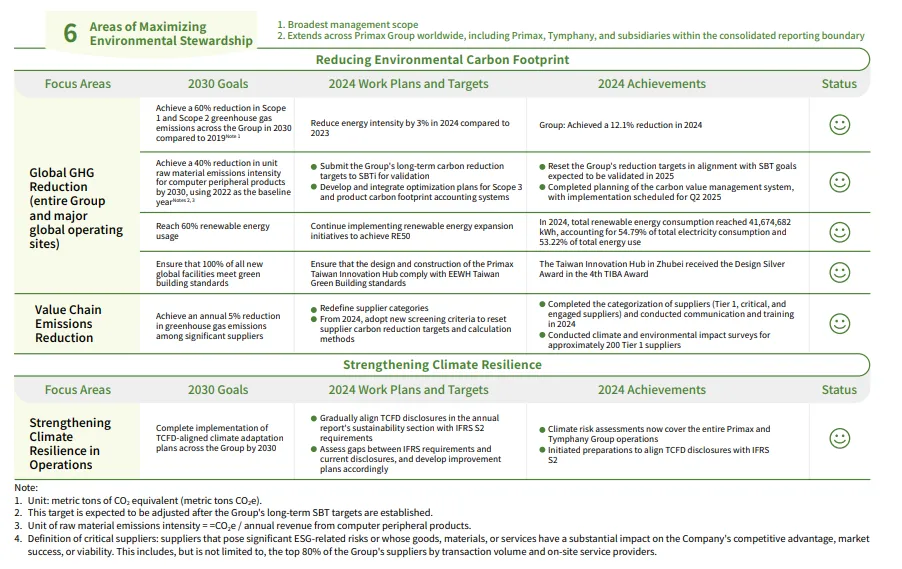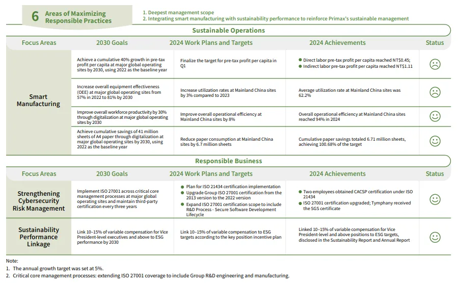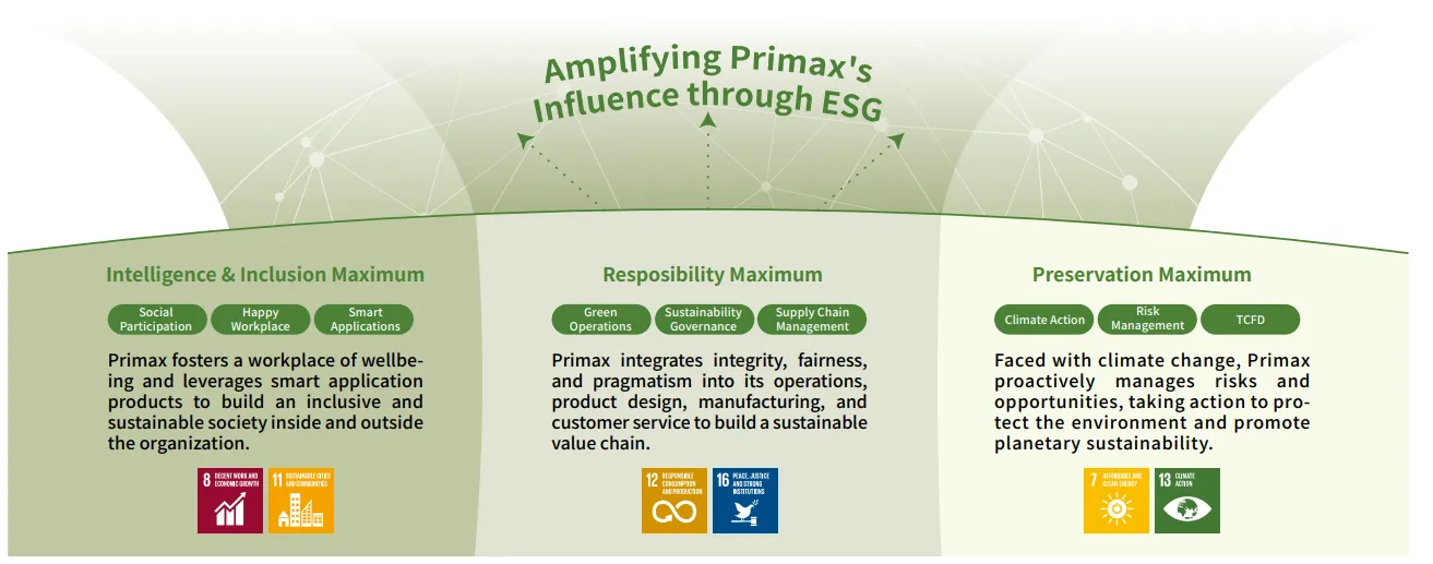 Under the spirit of P.R.I.MAX, Primax developed its sustainability strategy blueprint in 2022, aligning with seven of the United Nations Sustainable Development Goals (SDGs). The Company plans to implement corresponding action plans based on this blueprint. The blueprint comprises three core dimensions, each with defined performance indicators and target scopes assigned to responsible units. This approach ensures more precise assessment of implementation results. Performance is tracked regularly, and targets are adjusted on a rolling basis to align with global trends and further embed sustainability into business operations, supporting the Company's long-term sustainability vision.