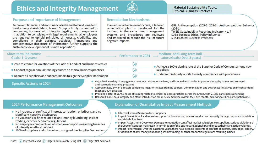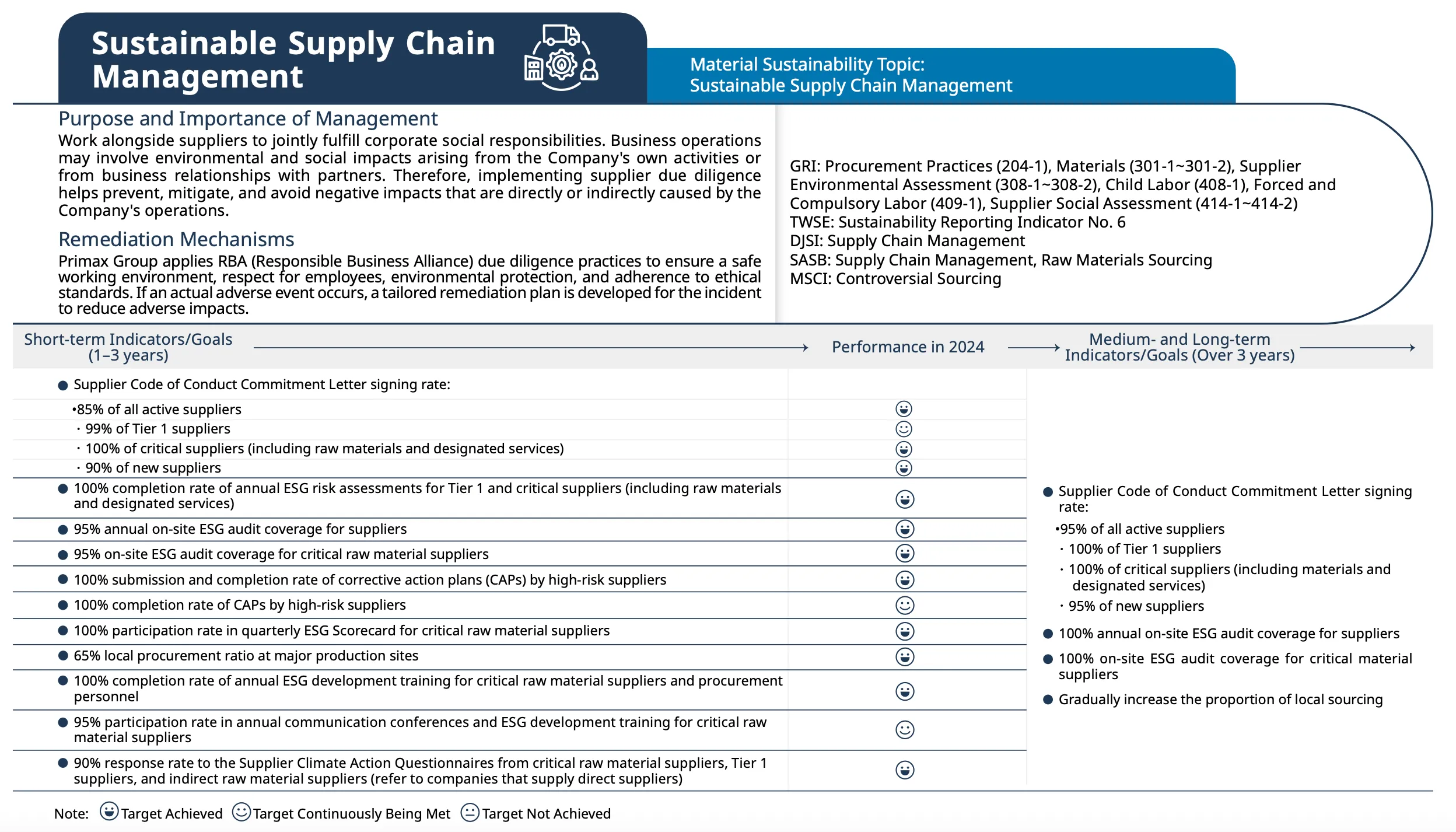 Based on the identified material sustainability issues, we have listed our short-, medium-, and long-term goals for these issues, the achievement rates for 2023, and the corresponding action plans. Additionally, we provide an explanation of other performance results beyond the quantitative targets. The achievement status is represented by icons in the achievement rate column: 😃 Goal Achieved, 🙂 Goal Achieved Continuously, 😐 Goal Not Achieved. Furthermore, for these material sustainability issues, we have also assessed the impact on external stakeholders and disclosed the relevant performance outcomes.