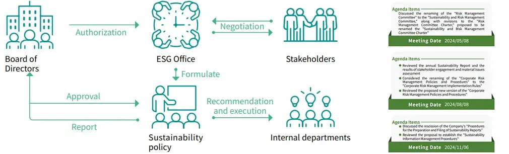 The ESG Office reports to the Board of Directors semi-annually, providing updateson stakeholder communication, significant events and disclosure material issues, greenhouse gas inventory conclusions, annual execution plans, and more, prior to the publication of the sustainability report. The specific implementation plans are then approved by the Board. At the end of the year, the ESG Office reports on the achievements of the planned executions,risk assessment results, and corresponding measures. This demonstrates Primax’s strong commitment to implementing sustainable development. In 2024, the Board of Directors convened a atotal of 9 meetings. The sustainability-related agenda items are summarized in the table below.