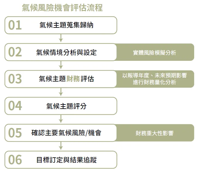 致伸針對國內外與氣候變遷相關法規及倡議進行研究與評估,作為集團制致伸針對國內外與氣候變遷相關法規及倡議進行研究與評估,作為集團制定環境政策之考量,以符合國內發展趨勢,增進公司因應氣候變遷之能力。氣候風險機會鑑別流程如下: