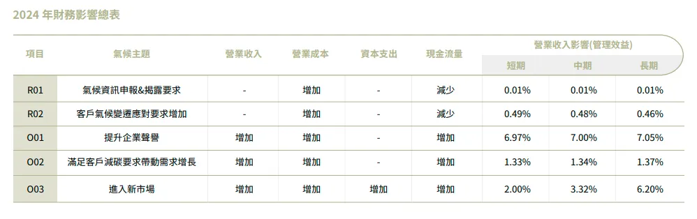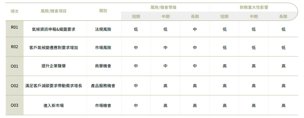 本年度評估設定時程為短期(2025-2026年)、中期(2027-2029年)及長期(2030-2034年),並逐一評估各氣候主題於短中長期的風險/機會等級。各項氣候主題依據「可能性 × 衝擊度」之分數落點進行風險等級鑑別,2024年評估結果無高風險項目,但有二項中、長期之潛在高機會項目。為求更貼進財務報導準則之精神,我們亦參照 IFRS 準則中財務重大性影響定義,進行雙重鑑別,以衝擊度得分4分作為具財務重大性影響之門檻。根據鑑別結果,2024 年無財務推估金額超過財務重大性門檻之氣候風險項目,但有3項氣候主題,預期將因投入對策有機會衍生正面財務效益。 綜合上述分析結果,經小組討論後,依公司實際狀況及未來可能面臨之挑戰,決議本年度主要氣候風險及機會如下表,並由企業永續辦公室針對鑑別結果進行因應策略、投入資源等討論與修訂,並持續追蹤每年評估結果之變化,定期進行結果呈報與決策擬定。