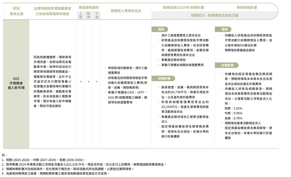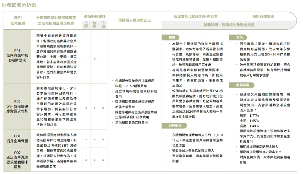 致伸密切注意全球氣候變遷趨勢與國際應變方向,將氣候變遷納入企業永致伸密切注意全球氣候變遷趨勢與國際應變方向,將氣候變遷納入企業永續發展的重大議題與關鍵性重大風險項目之一,持續進行分析與管控,並致力於溫室氣體的調適與減緩工作。2024年致伸進一步依循國際永續準則委員(International Sustainability Standards Board, ISSB)發布之國際財務報導準則第S2號氣候相關揭露(International Financial Reporting Standards S2, IFRS S2),並參考台灣金融監督管理委員會與財團法人中華民國會計研究發展基金會共同製作之IFRS S2氣候相關揭露之揭露範例,編製本年度氣候相關財務揭露報告書。完整揭露內容請參閱致伸集團發布之第四本《氣候相關財務揭露報告》,或參閱本報告書《2.1 永續管理與實踐》及《3.6風險管理章節》。部份內容摘要如下: