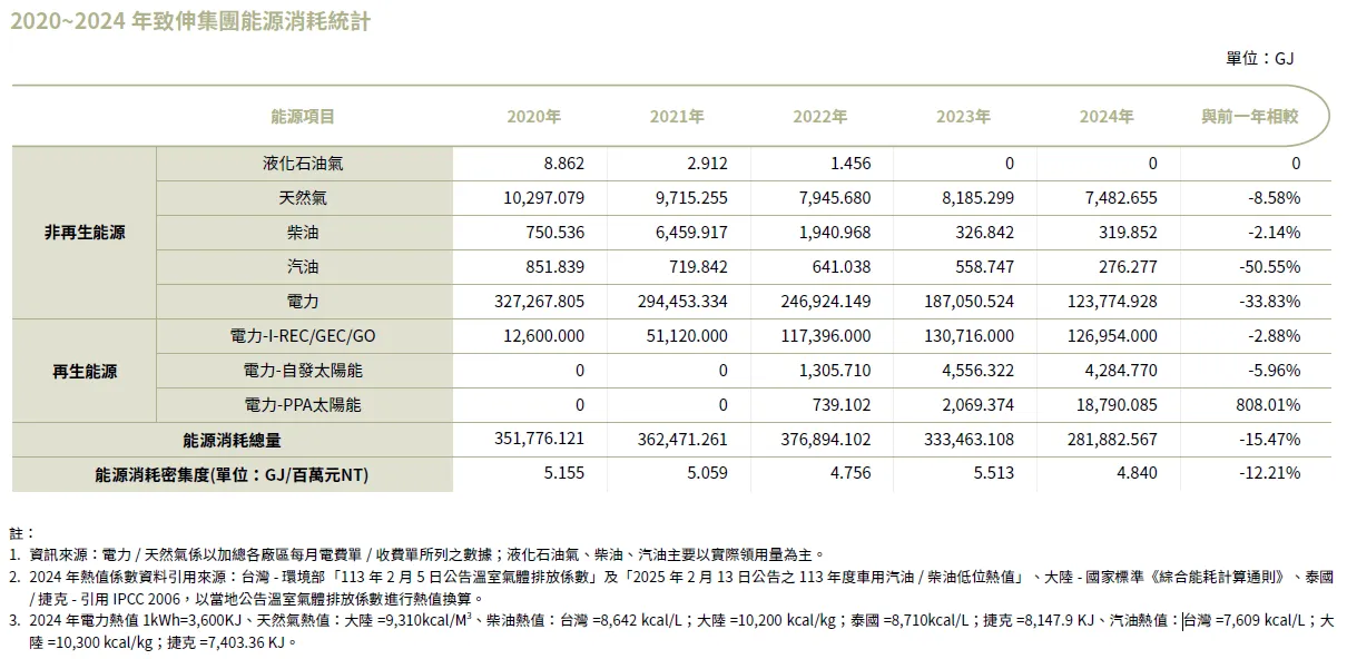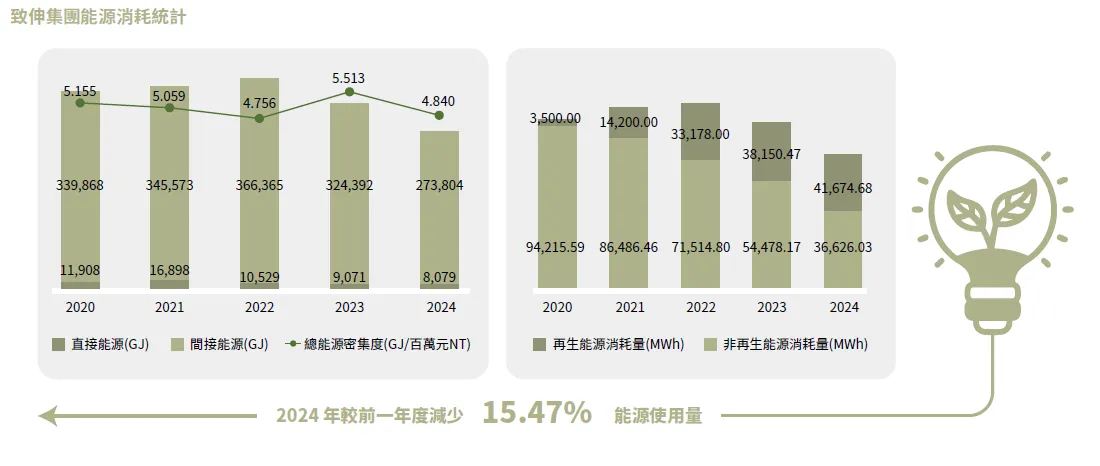 致伸已於2022年4月29日加入RE 100倡議活動,承諾於所有據點導入使用再生能源,並積極制定以上再生能源目標。除積極推動節能方案外,為達到2040自2019年起逐年增加再生能源憑證購置比例,2022年開始建立太陽能發電裝置,2023 年持續增加再生能源使用,以期達到2040年碳中和的目標。
