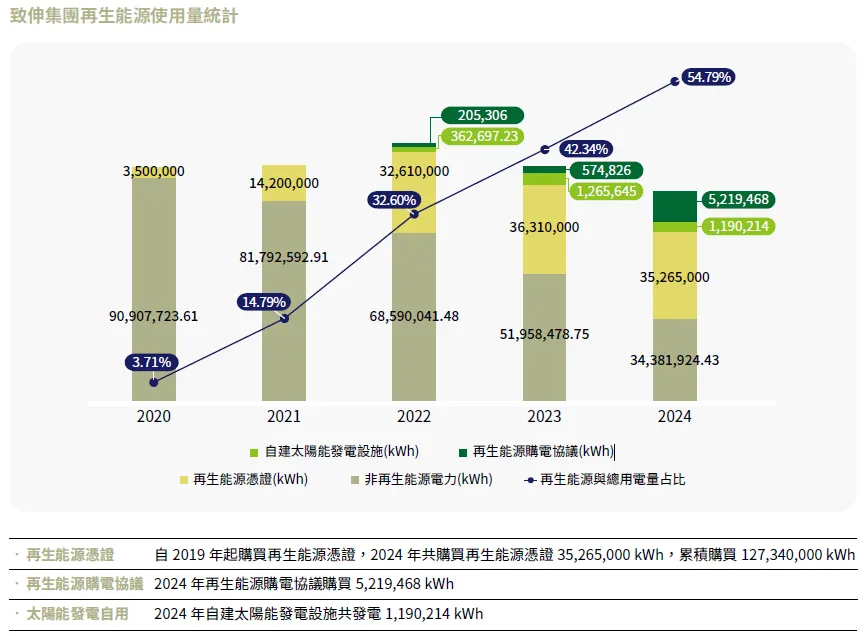 致伸集團自2019年起開始推動再生能源使用計畫,主要透過購買再生能源 憑證 (Energy Attribute Certificate,EAC)、自建太陽能發電設施與再生能源購電 協議 (Power Purchase Agreement,PPA) 來增加再生能源使用量。2022年4月致 伸加入 RE 100,制定再生能源使用目標,預計2040年100% 使用再生能源。