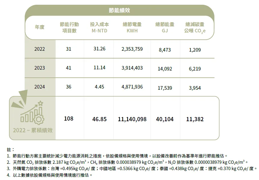 為了讓重要製造據點更有效的使用能源,我們探索各種節能方案,致力打造低耗能的廠房設備。並且透過高耗能設備汰舊換新,戮力邁向節能廠房的終極目標。2024年具體措施包括自建太陽能發電設施、更換天然氣鍋爐為空氣熱泵熱水器、空調及照明設施使用行為改變、更換節能馬達電機、優化空壓機使用率、冰水機系統更新與能效提升、廠房、倉庫、路燈等照明更換為LED燈或太陽能路燈、空壓機更換為變頻式等,2024年共計節電量4,871,936 kWh,節能量約17,539GJ,減碳量約3,954 tCO2e。請見《2024年重要製造據點節能方案統計表》。 註:節能行動方案主要統計減少電力能源消耗之措施,依設備規格與使用情境,以2022年( 設備改善前)作為基準年進行節能推估。