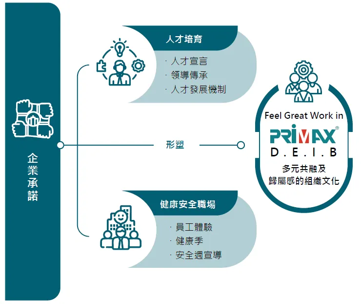 我們承諾透過【人才培育】和打造【健康安全職場】兩大主軸建立多元、平等、共融及歸屬感的組織文化。在人才培育方面,我們透過人才宣言、領導傳承以及人才發展機制來達到多元發展、共融成長的目標;而在健康安全職場部分,我們則透過不斷優化員工體驗、推廣健康意識及活動,以及提供友善家庭的機制,讓員工感受到平等以及有歸屬感的工作職場。