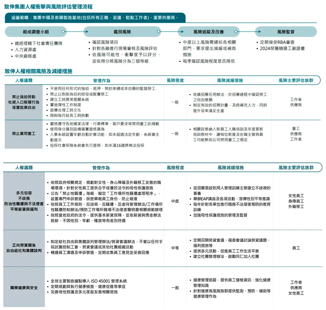 致伸集團除了平等對待每一位致伸同仁外,我們參考RBA責任商業聯盟行為準則、聯合國世界人權宣言、國際勞工組織公約等國際規範,訂定不歧視、禁用童工、杜絕強迫勞動、尊重員工結社自由的人權政策,針對全體員工(包括臨時、契約員工和派遣工作者),以及現有供應商定期進行人權風險評估,並針對風險項目追蹤及確認因應措施,以打造公平、安全、舒適之職場環境視為己任,徹底根絕相關違反人權的議題。2024年無重大歧視、童工、強迫勞動、自由結社和集體談判等人權風 險,若有實際事件發生,將啟動對應之人權相關風險減緩措施。