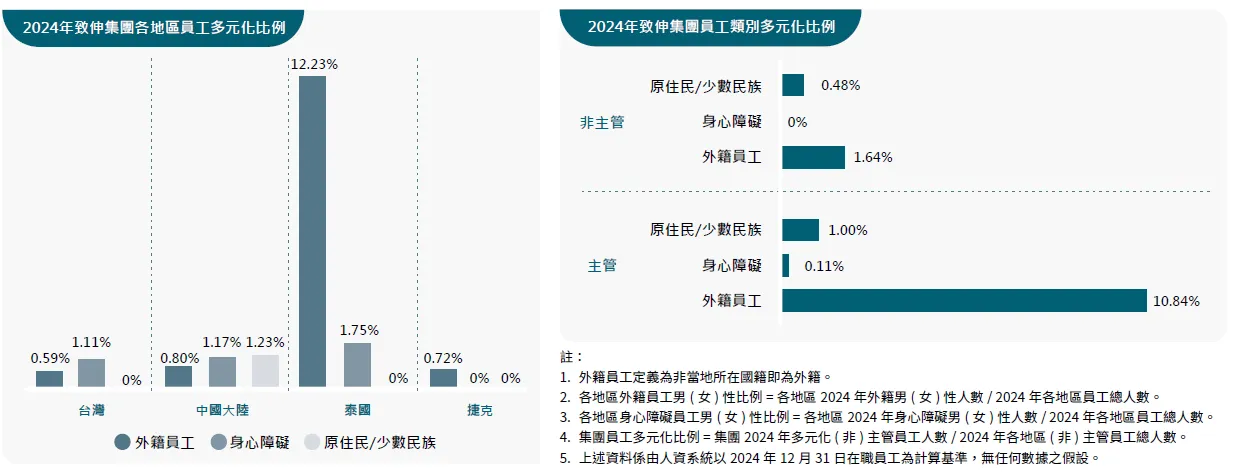 本集團尚秉持多元職場之目標,除了本地員工外,還招收外籍員工,使公司及員工接觸不同國家之風俗民情,同時進行國際交流,獲得更多不同面向的觀點與思維;我們仍重視社會關懷,因此公司每年維持保障身心障礙名額,讓身心障礙人士除了有地方能一展長才,亦能滿足生活上的需求。而致伸台北更達成足額進用身心障礙員工,顯示我們推行平等友善職場不遺餘力。