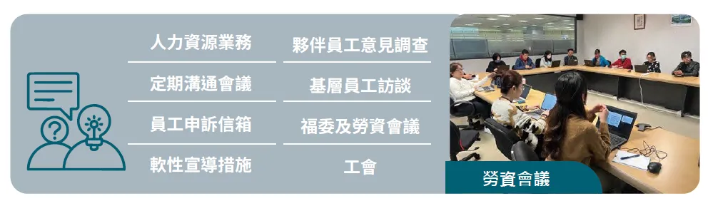 各申訴管道與工會委員充分發揮職能,幫助員工傳達問題,通過會議使問題能得到有效地改善。集團員工透過勞資會議、工會、福委會議、意見信箱管道,進行意見反應與溝通,2024有664件,其中664件已解決並回覆,回覆率達100%。