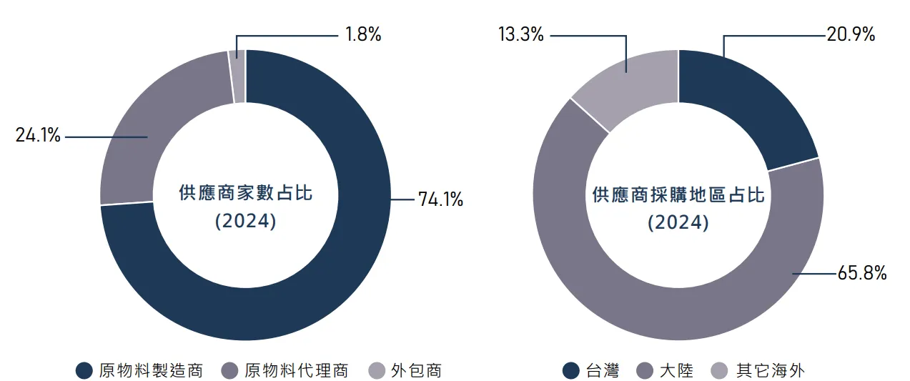 致伸集團所服務的產品以搭配桌上型、筆記型電腦及平板、手機等使用;產品包括鍵盤、滑鼠、鍵盤模組、觸控板模組、高速傳輸塢、電競遊戲裝置、創作者裝置週邊及無線充電等,其中以鍵盤及滑鼠為主要銷售項目,供應鏈原物料廣泛包含 IC、印刷電路版、電子元件、塑膠料件、金屬料件、包材…等。致伸與全球1,964家原物料供應商合作,包括原物料製造商1,498家、電子零件原物料代理商433家及外包商33家;若依地域性區分,台灣地區供應商數量為280家,大陸與香港地區有1,325家,海外359家。2024年總交易金額約39,865百萬NT。
