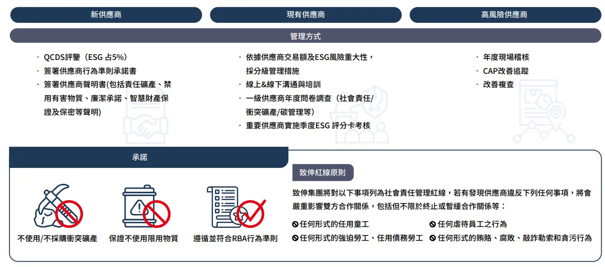 致伸集團實踐負責任的採購管理,供應商需要承諾遵守當地法規及行業行為規範,保護員工的合法權益。為進㇐步規範負責任採購管理作業,致伸集團特制訂《供應商行為準則》。基於ILO(國際勞工組織)、RBA(責任商業聯盟)、公認的社會責任相關管理體系(ISO 45001、ISO14001 等)及客戶就勞工人權、環境與職業健康安全、衝突礦產管理及商業道德標準的要求制訂,適用於致伸集團及旗下所有子公司之供應商。