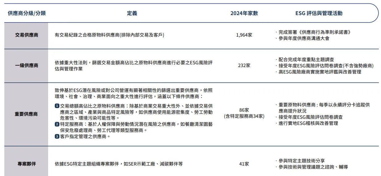 致伸持續精進供應商管理方式,於2023年全面檢視基於永續風險管理需求的供應商管理制度,從調查評估、溝通提升、協作等面向,明確供應商ESG 管理計畫。我們執行供應鏈管理的永續發展計畫,以確保重要的議題在永續供應鏈管理實質化,並達成建立可持續的供應鏈體系。為提升管理效率,採分級管理措施,自2024年起全面展開。