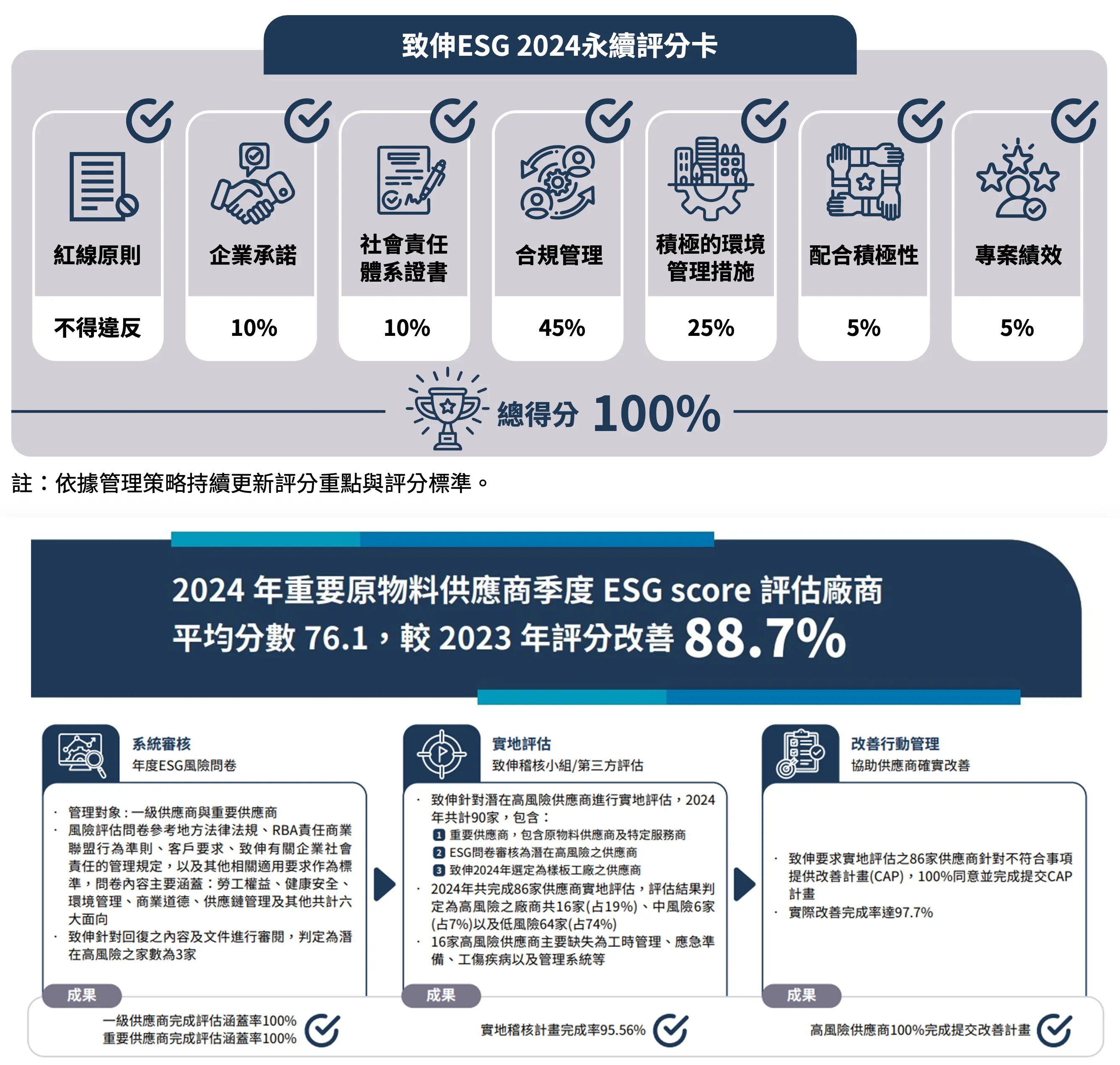 致伸透過每季的永續評分卡評估重要供應商在ESG的表現,依據供應商ESG得分區間給予其當季QCDS總分至多10%正負影響權重,最終獲得之綜合績效等級若連續兩季C級(60分以下),則啟動新專案停止申請機制,期望以此札實的滾動機制將整體供應鏈可持續發展水平拉升。供應商表現良好或有特定標竿做法者將於每年供應商溝通大會公開表揚與分享執行經驗,促成業界更多的經驗共享。