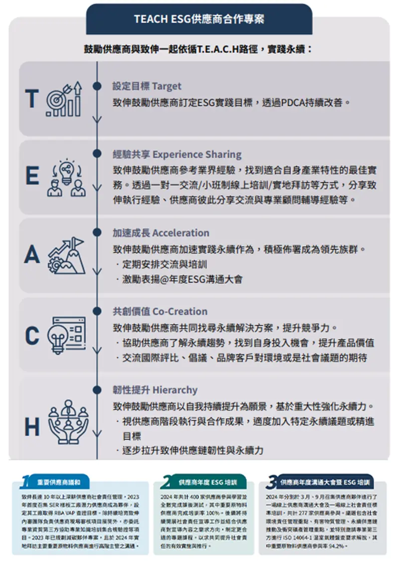 在可持續發展議題持續加廣加深的快速步調下,致伸不曾歇息、也不曾缺席;我們以符合客戶與投資人的期待為基石,以尋找永續共好解方為目標,期望透過業界夥伴結盟將產業資源與效益最大化,同時呼應聯合國永續目標SDG17。致伸的目標是透過【TEACH ESG供應商合作專案】攜手供應商夥伴一同努力,將關注特定永續議題召集供應商成為夥伴,竭力為供應商創造更多學習及提升的機會與資源,以求共同進步。
