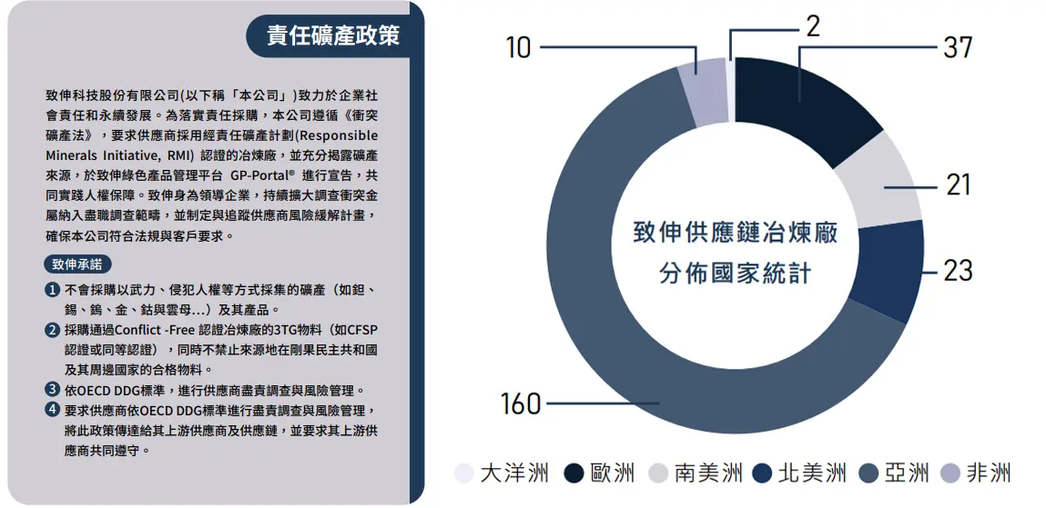 致伸自2012年開始,明確遵循《衝突礦產法》不使用及不採購來自剛果民主共和國衝突區域之衝突金屬( 如:鉭、錫、金、鎢),要求供應商都必須承諾採用負責任的礦料來源,努力確保產品中所使用的礦料( 如:坦、錫、金、鎢),不會為武裝衝突帶來獲利,並已將此政策納入供應商採購管理提供及產品設計的必要項目,供應商若有使用衝突金屬時,必須被強制揭露冶煉廠資訊,並於致伸綠色產品管理平台GP-Portal® 進行宣告。【2024年致伸科技衝突礦產報告請點連結下載】