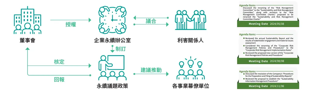 企業永續辦公室每半年一次向董事會報告,於永續報告書出版前說明利害關係人溝通情形、重大事件和揭露主題、溫室氣體盤查結論、年度執行計畫等,再由董事會核定具體推動計劃。年底則報告計畫執行成果、風險評估結果及因應措施,由此可見本公司落實永續發展的強烈決心。2024 年董事會共計召開9 次會議,其中與永續相關議案內容如下表所示。