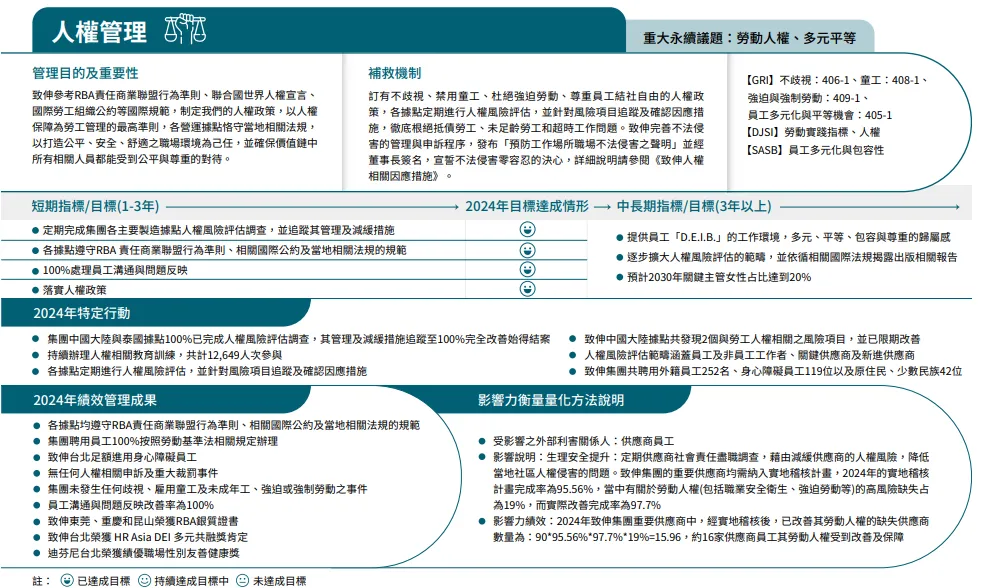 致伸根據所鑑別出來的永續重大議題,以下列出我們針對這些議題所設定的短、中長期目標、2024年度的目標達成率,以及對應目標所擬定的行動方案,和量化目標之外的其他績效成果說明,並於目標達成率欄位中,以圖示代表達成狀況:😃已達成目標 🙂持續達成目標中 😐未達成目標。除此之外,針對這些永續重大議題,我們同時衡量了對外部利害關係人的影響程度及揭露其相關行動績效。