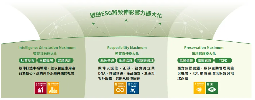 致伸身為資訊、電子與消費產品的一流解決方案供應商,正派、務實是我們致伸身為資訊、電子與消費產品的一流解決方案供應商,正派、務實是我們的企業文化更是核心價值觀,在這樣的價值觀之下,我們的企業使命包括:卓越品質、創新研發、智能製造和穩健成長。因此,如同致伸的企業名稱PRIMAX,我們希望以多元合作為核心,透過ESG 的永續作為在「環境保護」、「務實責任」及「智能應用」這三個面向,將自身影響力極大化為目標,同時對內激發員工以公司為榮(Pride)的向心力。