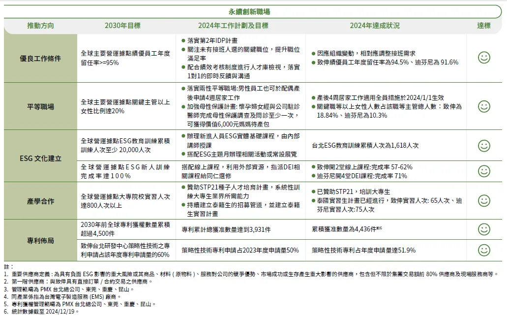 公司致力於透過「人才培育」與「健康安全職場」兩大支柱,打造多元、公平、共融且具歸屬感的組織文化。在人才培育方面,我們透過《人才宣言》、領導接班計畫與人才發展機制,推動多元成長與共融發展;在健康安全職場方面,我們持續優化員工體驗,推廣健康意識與活動,並提供友善家庭支持制度,營造員工感受到尊重、平等與連結的工作環境。 此外,我們承諾遵守各據點當地的勞動法規及內部工作規則,並依照以下原則保障員工勞動權益: