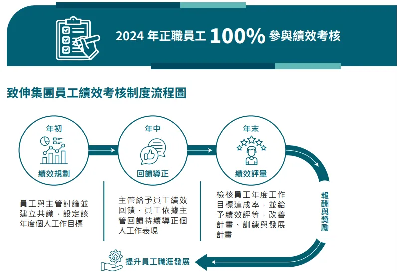 除到職未滿3個月的正職員工及定期契約的臨時員工外,致伸台灣、大陸廠區及泰國廠所有正職員工均能參與績效考核;而迪芬尼所有員工均能接受績效考核,提供員工一個公平的晉升發展機會。