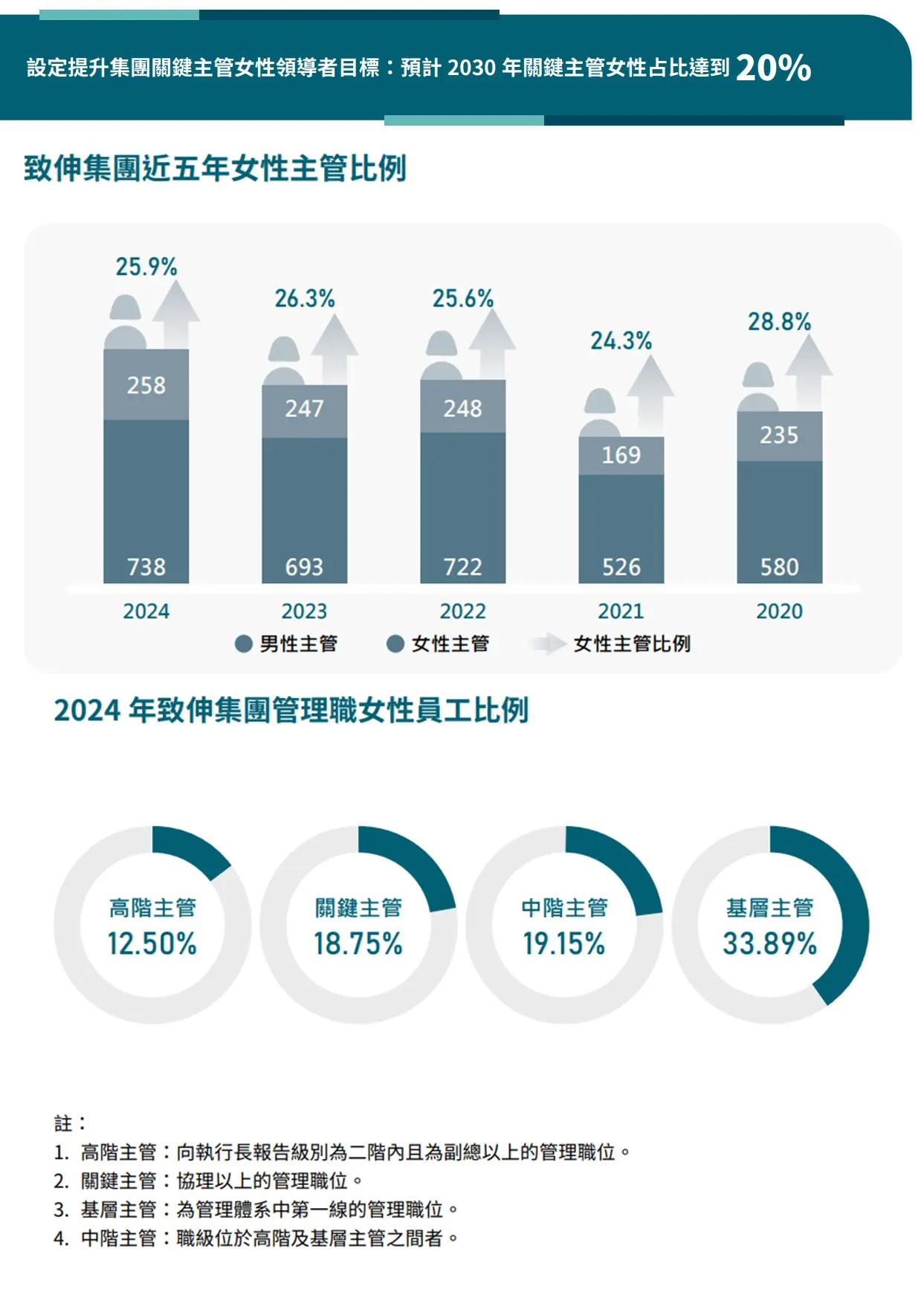 致伸集團秉持著公平公正的人才發展理念,作為致伸集團的一份子,人人都能在此安心且自由地釋放潛能、一展長才。為了能達到此種願景與理念,致伸近幾年致伸集團秉持著公平公正的人才發展理念,作為致伸集團的一份子,人人都能在此安心且自由地釋放潛能、一展長才。為了能達到此種願景與理念,致伸近幾年在企業永續經營目標的設定上,致力於促進性別平等及消弭不公平的升遷障礙。爰此,我們將有意識地培養女性高階管理者,在各個領導階層中拔擢年輕有潛力的女性人才,並提升高階女性領導者占比,預計在2030 年,關鍵女性領導人比例可穩定成長到20 %。