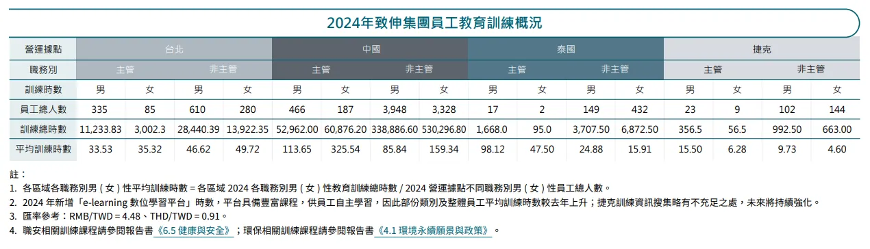 致伸集團重視員工職涯發展,所有員工均可接受教育訓練。2024年致仲集團員工參與由人力資源處所辦理的課程(不包含職安、環保課程等),訓練時數總計1,054,032小時,平均每人訓練時數108小時,總訓練費用6,966,456.3元。